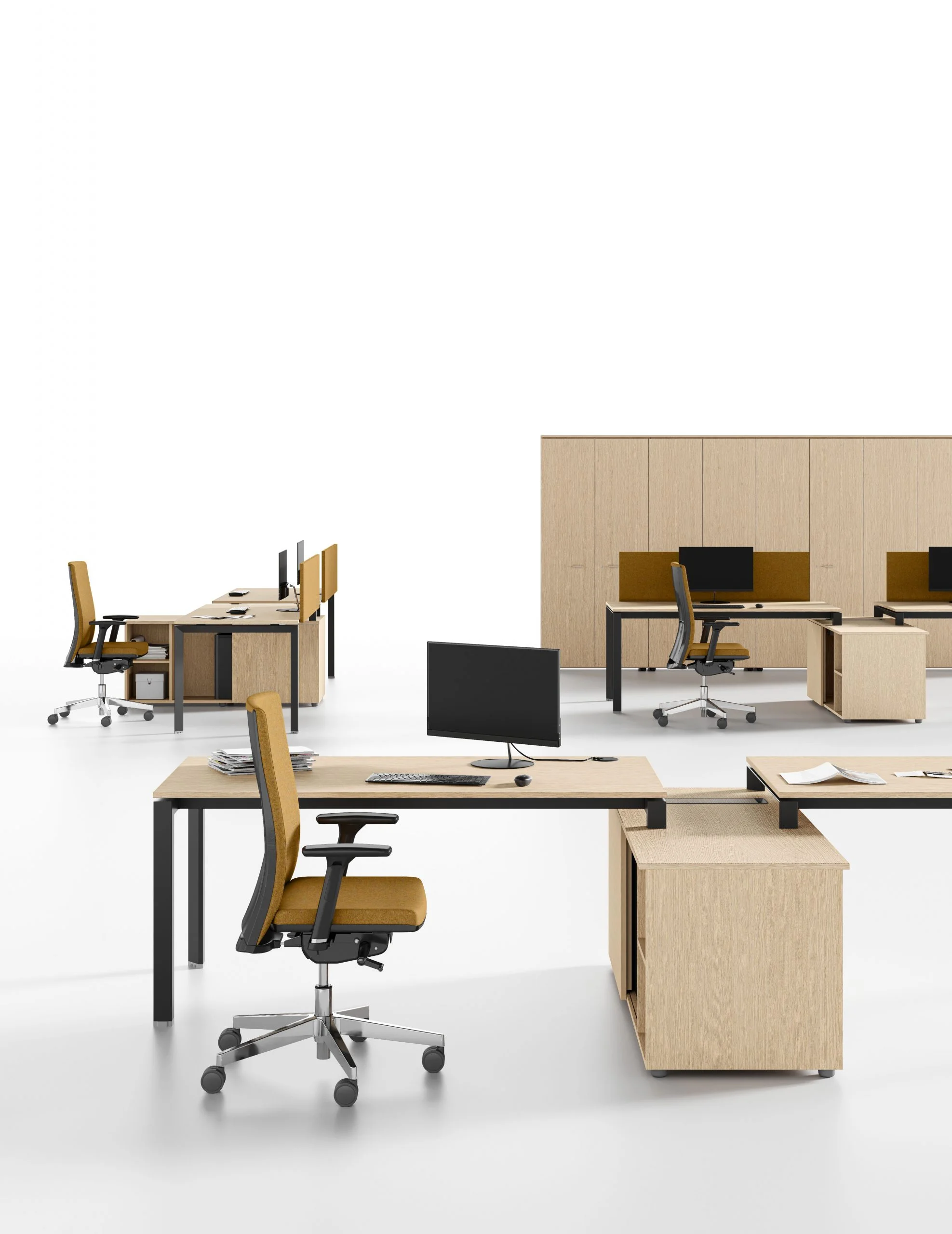 5th Element Stanowiska pracownicze przystosowane do wielu akcesoriów, idealnie odpowiadające potrzebom nowoczesnej i wydajnej przestrzeni biurowej. Panele akustyczne z drukowanego filcu wyznaczają strefy pracy i zapewniają optymalny komfort akustyczny, lokalnie i w całym otoczeniu.
