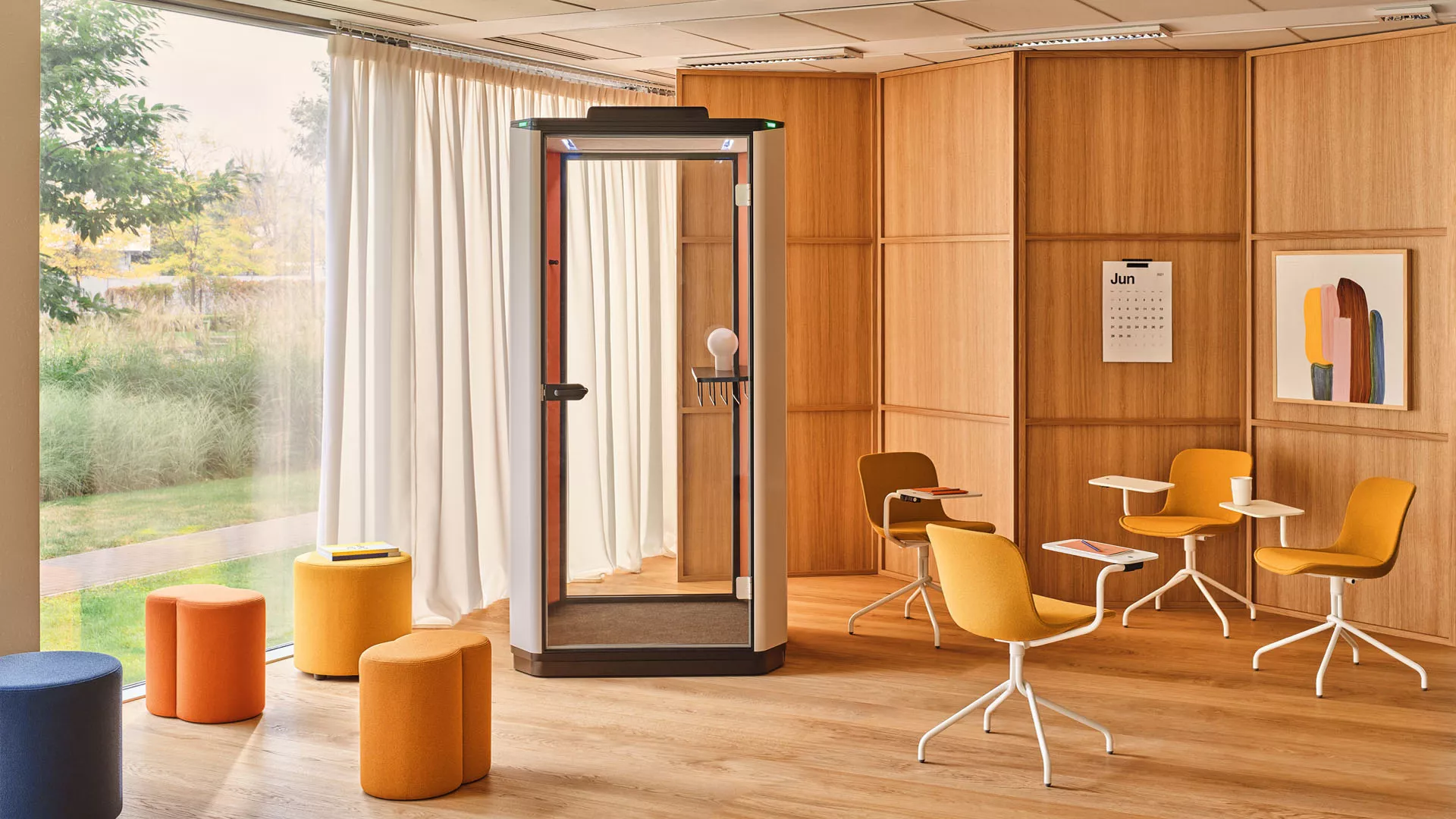 Nowoczesna budka stanowi połączenie funkcjonalności, estetyki i technologii, zapewniając ciszę i prywatność podczas rozmów telefonicznych, wideokonferencji i indywidualnej pracy w skupieniu. Zewnętrzne oświetlenie sygnalizuje dostępność budki, świecąc się na czerwono, gdy ktoś jest w środku. Sterowanie sygnalizacją umożliwia panel sterowania, powiązany również z systemami wentylacji i oświetlenia wewnętrznego. Użytkownik może regulować nawiew i jasność światła, dopasowując je do własnych potrzeb. Ciche wentylatory nie zakłócają rozmów ani skupienia, a stalowa konstrukcja harmonijnie komponuje się ze szklanymi i tapicerowanymi elementami pochłaniającymi dźwięk. Dzięki temu Coda sprawdzi się doskonale nawet w dynamicznych, głośnych i tętniących życiem wnętrzach.