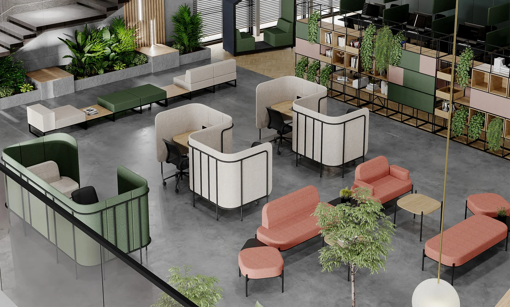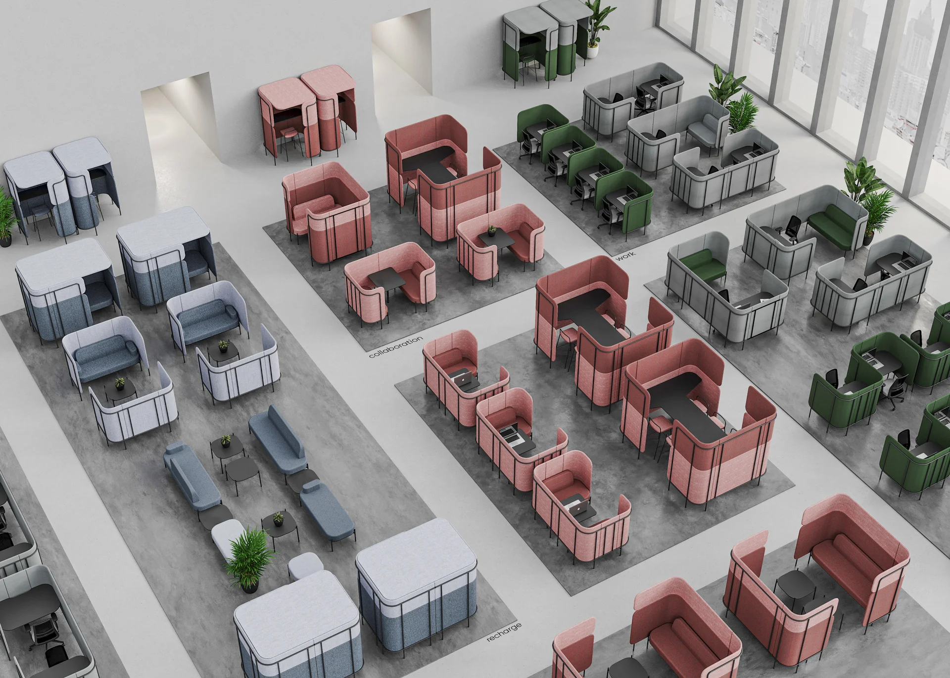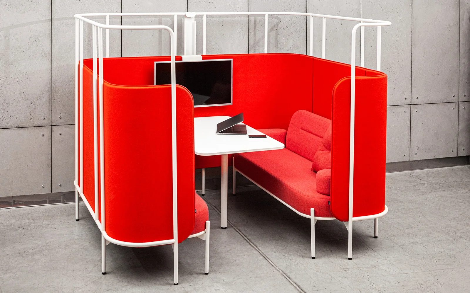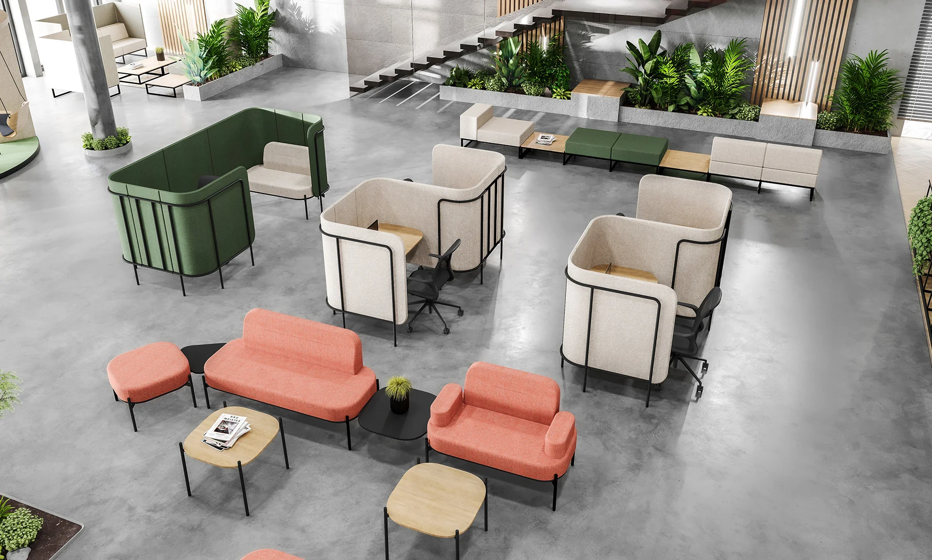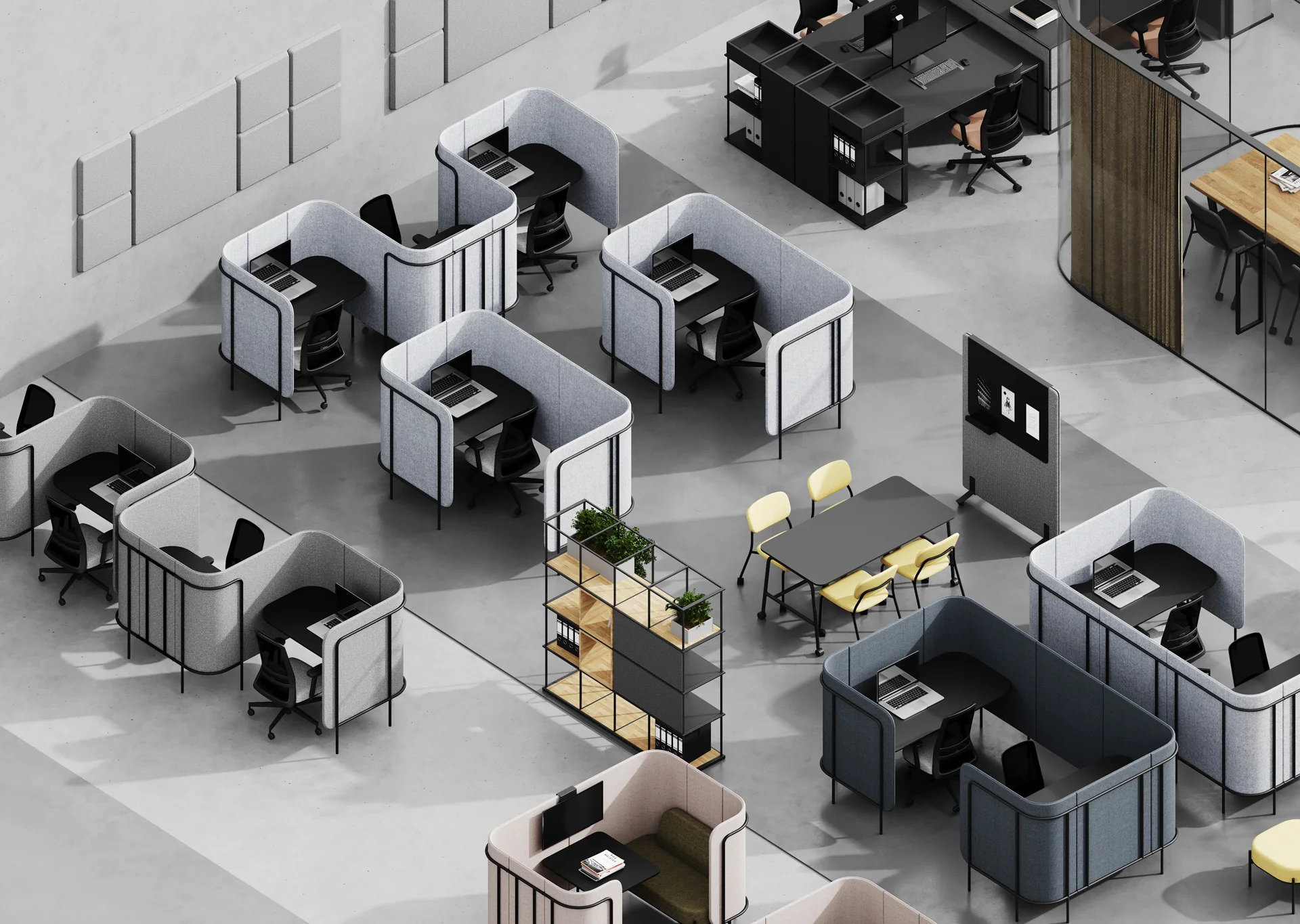 Open space z prywatnym miejscem do indywidualnej pracy nie jest już marzeniem, ale rzeczywistością na wyciągnięcie ręki. Z jednej strony klika stanowisk pracy ułatwia komunikację, z drugiej natomiast zapewnia możliwość pracy w odizolowaniu. Leaf_Pod to oddzielone miejsca pracy z opcjonalnymi media portami i wyborem przydatnych, mobilnych akcesoriów, takich jak tablica magnetyczna, haczyki na klucze i narzędzia biurowe. Kluczem do sukcesu w biznesie jest dobrze skoordynowany zespół, który potrafi ze sobą współpracować. Jeśli chcesz robić postępy, musisz się skoncentrować. Możesz spróbować w strefie oddzielonej od reszty biura wyposażonej w dach, stół i krzesła. Kolekcja Leaf_Pod zawiera zestawy idealne dla miejsc wymagających ciągłej komunikacji i współpracy.