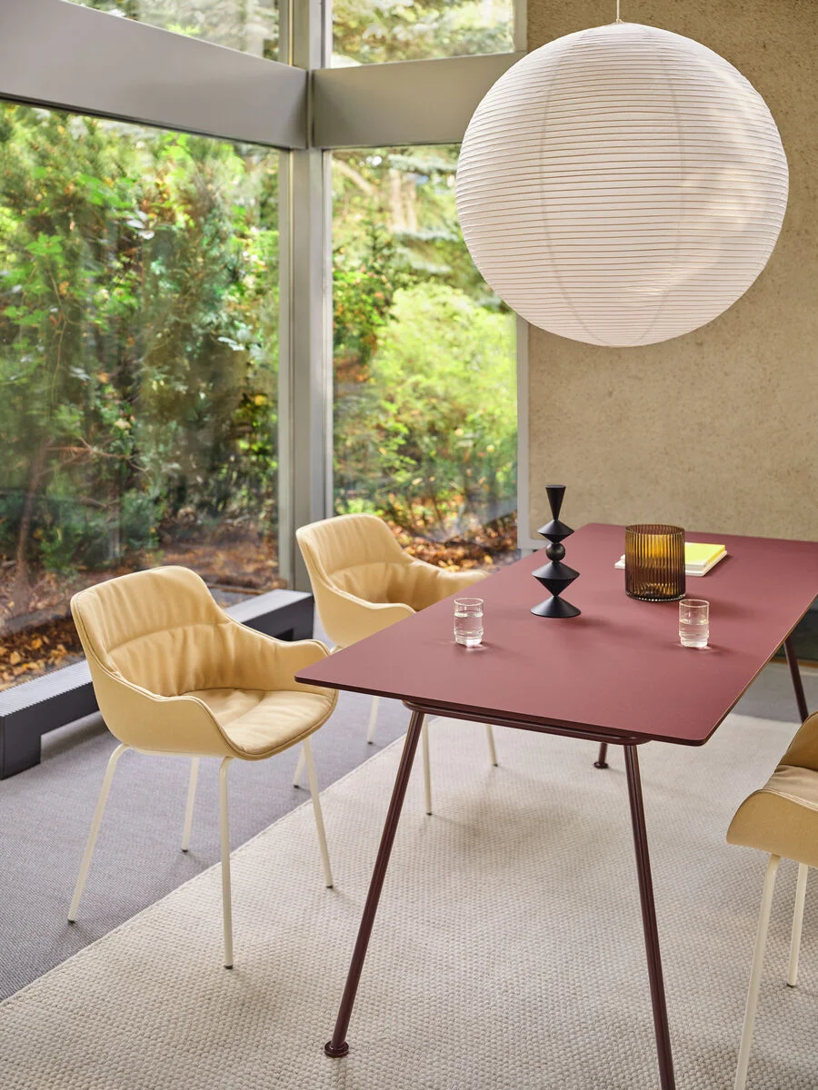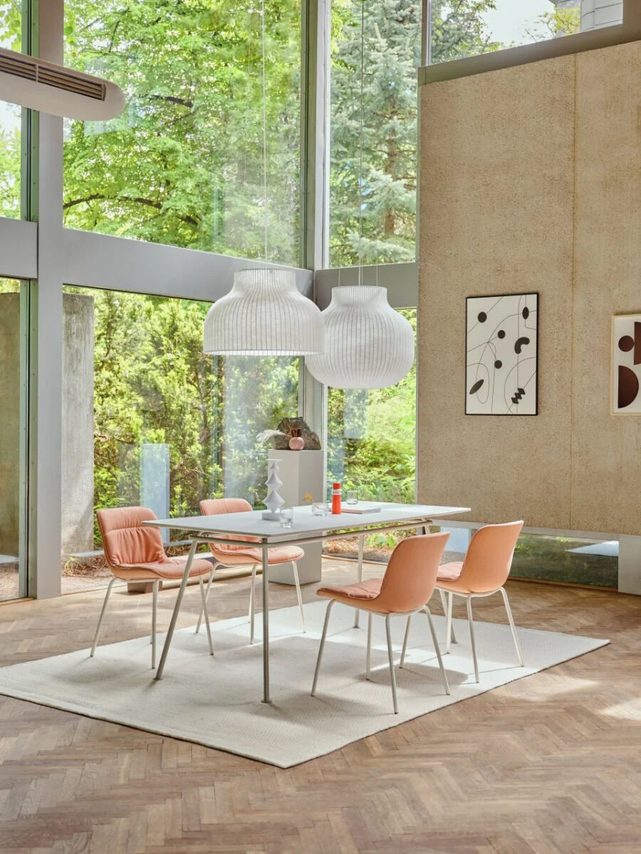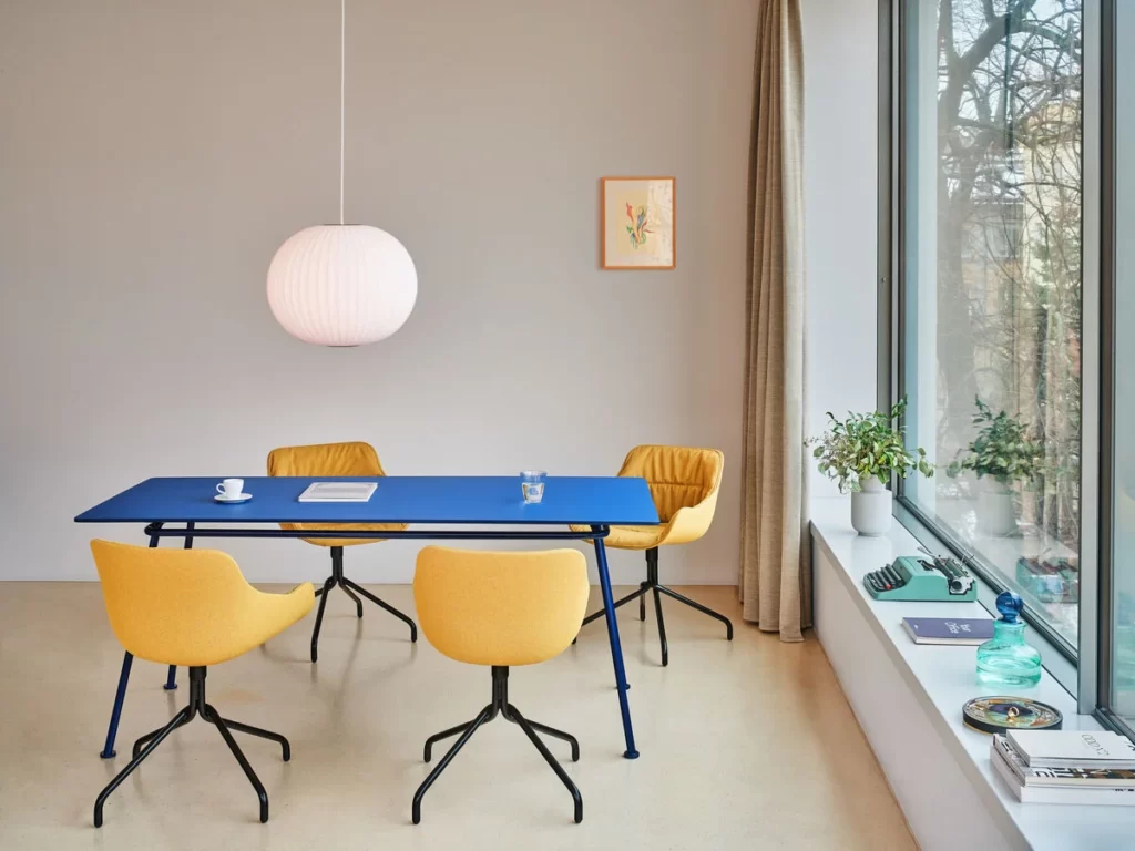 Zaprojektowany przez studio Form Us With Love stół New School nawiązuje do krzeseł z gamy. Wychodząc od nostalgii za krzesłem szkolnym, projektanci stworzyli serię produktów na stelażu z giętych rurek. Lekka forma wysokiej wersji stołów daje się adaptować do różnych przestrzeni dzięki możliwości wyboru kształtu i wymiarów blatu. Wszędzie wygląda nowocześnie i przyciąga uwagę jednym z dostępnych mocnych kolorów. Proste formy i mocne kolory stołów powstały z myślą o wnętrzach i możliwości dopasowania do różnych przestrzeni. Maksymalnie praktyczne, sprawdzą się w wielu kontekstach. Wysoki stół New School będzie idealny do różnego rodzaju lokali gastronomicznych: barów, restauracji, bistro i kawiarni, a nawet biurowych kantyn. Najnowszy z rodziny New School – stół typu bench charakteryzuje się wydłużonym, podwójnym blatem o długości od 2400 do nawet 3600 mm, dzięki czemu będzie wygodny dla większych grup użytkowników. Sprawdzi się doskonale podczas wspólnych sesji roboczych, spotkań oraz konferencji. Podstawy z giętych rurek, blaty wykończone linoleum i intensywne kolory to elementy wspólne dla wszystkich stołów z rodziny zaprojektowanej przez studio Form Us With Love. Sprawia to, że stoły typu bench doskonale dopełnią aranżacje, w których znajdują się stoły i siedziska z rodziny New School. Szczególnie dobrze wpiszą się we wnętrza biurowe, edukacyjne i ogólnodostępne, w których przy wspólnej pracy (lub posiłku) gromadzą się większe grupy. Blaty pokryte laminatem są odporne na odciski palców i łatwe do wyczyszczenia, co jeszcze zwiększa funkcjonalność stołu umieszczonego w przestrzeni publicznej.