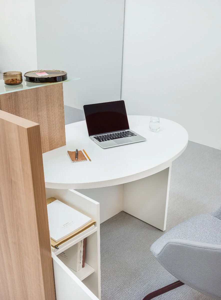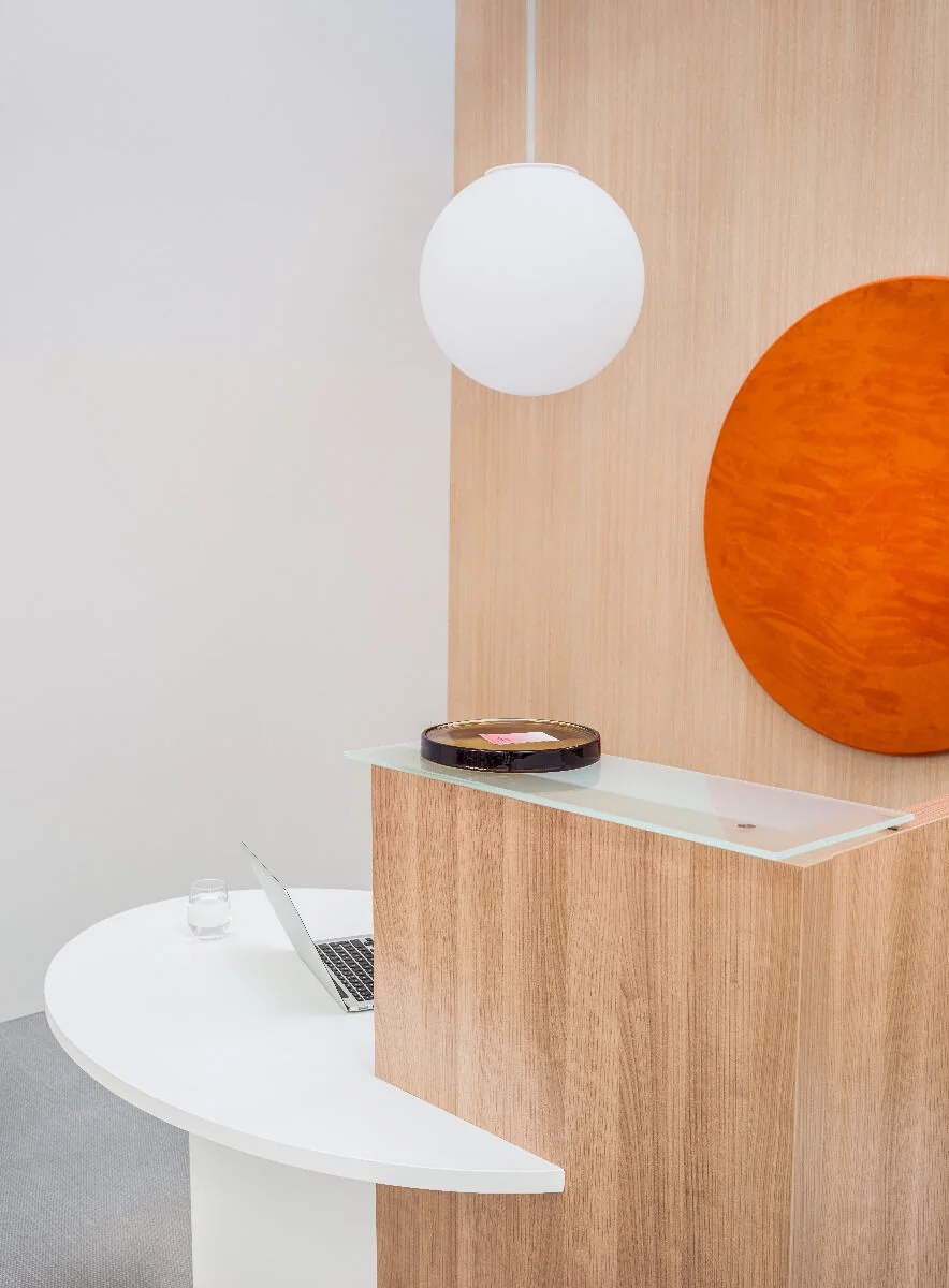 Niewielka, lecz maksymalnie praktyczna – lada recepcyjna Ovo w optymalny sposób łączy cechy stanowiska obsługi i indywidualnego miejsca pracy. Owalny blat pełni jednoczesną funkcję powierzchni roboczej i obniżonego elementu recepcji, dzięki czemu powstaje wielofunkcyjna lada dopasowana także do potrzeb osób niepełnosprawnych. Podwyższona część umożliwia pracę w pozycji stojącej, ukrywając stanowisko komputerowe oraz półkę na dokumenty. To rozwiązanie oszczędzające przestrzeń, co sprawia, że lada Ovo sprawdzi się jako element wyposażenia salonu kosmetycznego, fryzjerskiego i innych niewielkich pomieszczeń.