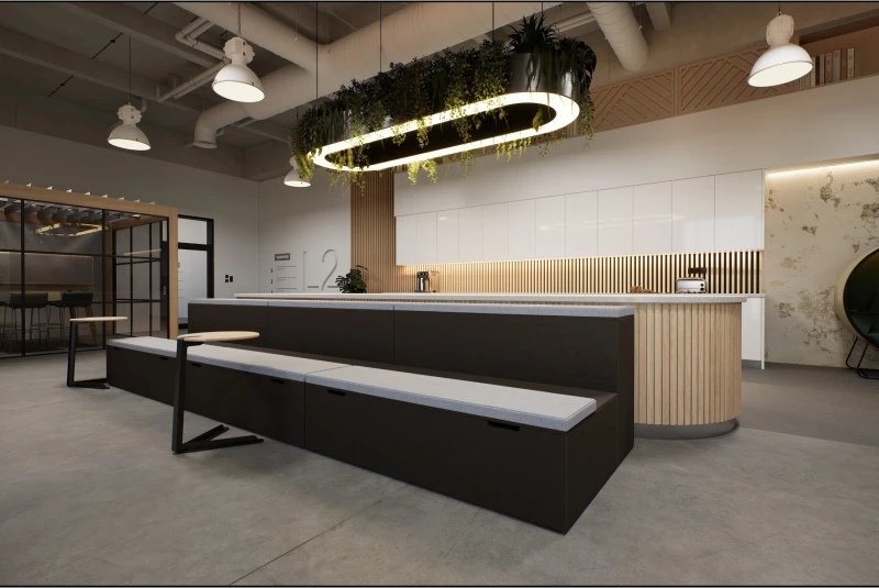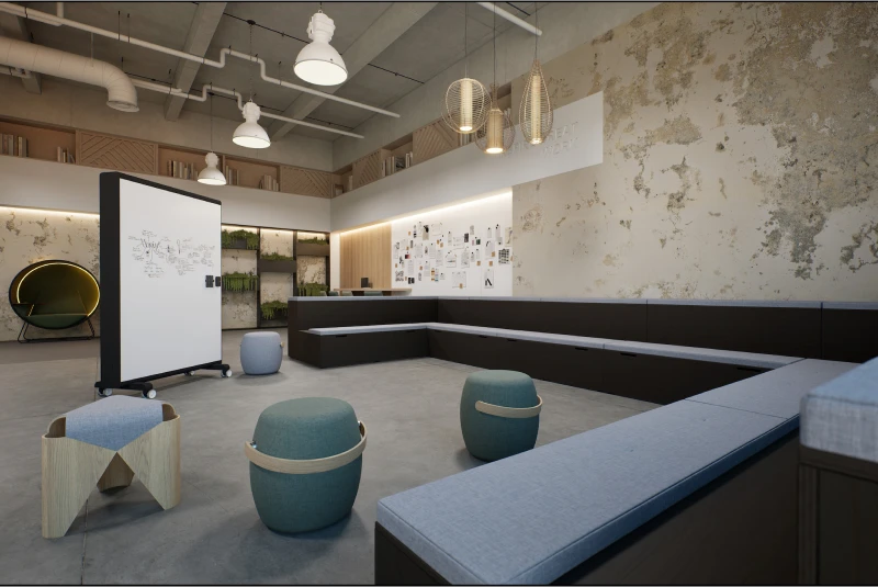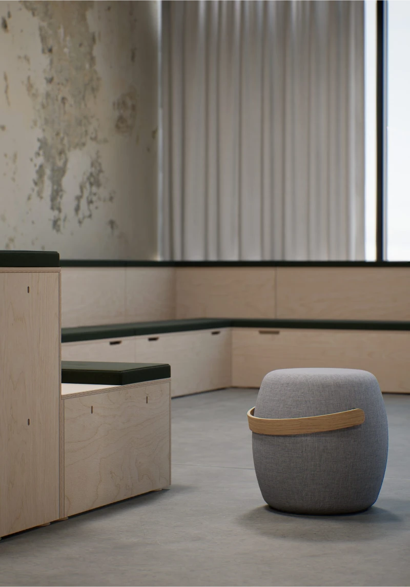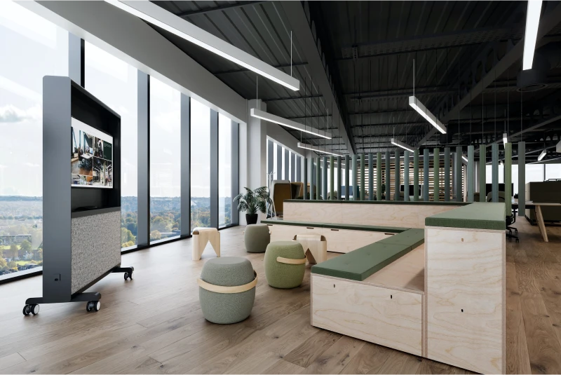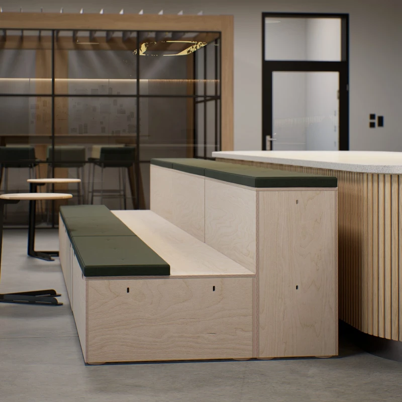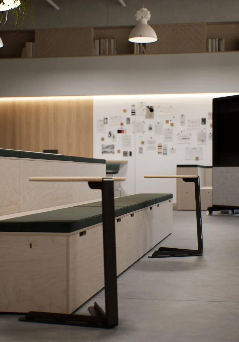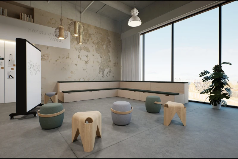 Moduły posiadają wbudowane schowki pod siedzeniami oraz tapicerowane poduszki, zapewniające komfort i funkcjonalność. Dodatkowe opcje, takie jak zintegrowane źródła zasilania, blokowane kółka oraz wykładziny podłogowe, zwiększają mobilność i ochronę. Prosty montaż bez narzędzi sprawia, że całość jest łatwa do dostosowania do potrzeb użytkownika i pozwala tworzyć różnorodne konfiguracje, takie jak przestrzenie do nauki i prezentacji.