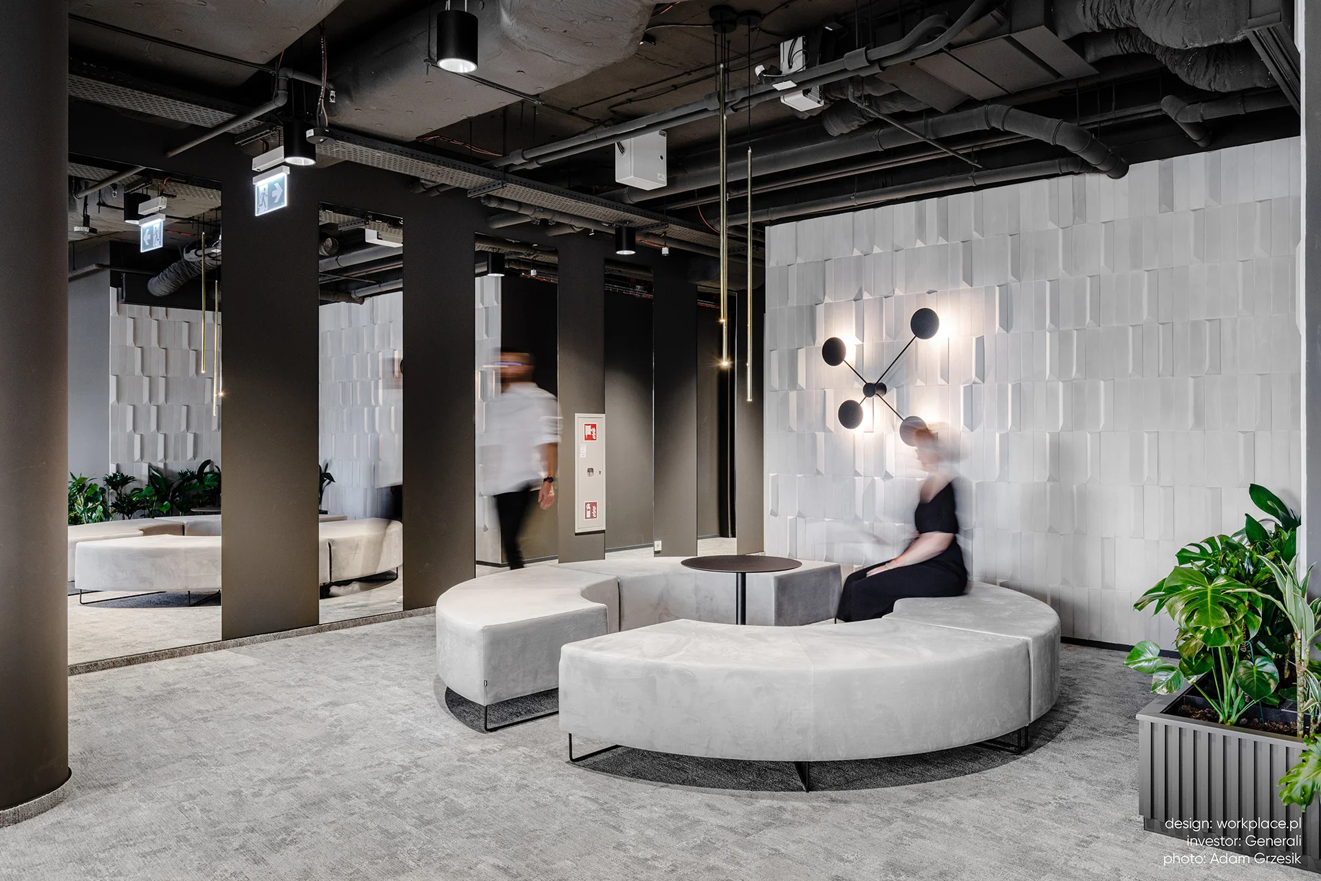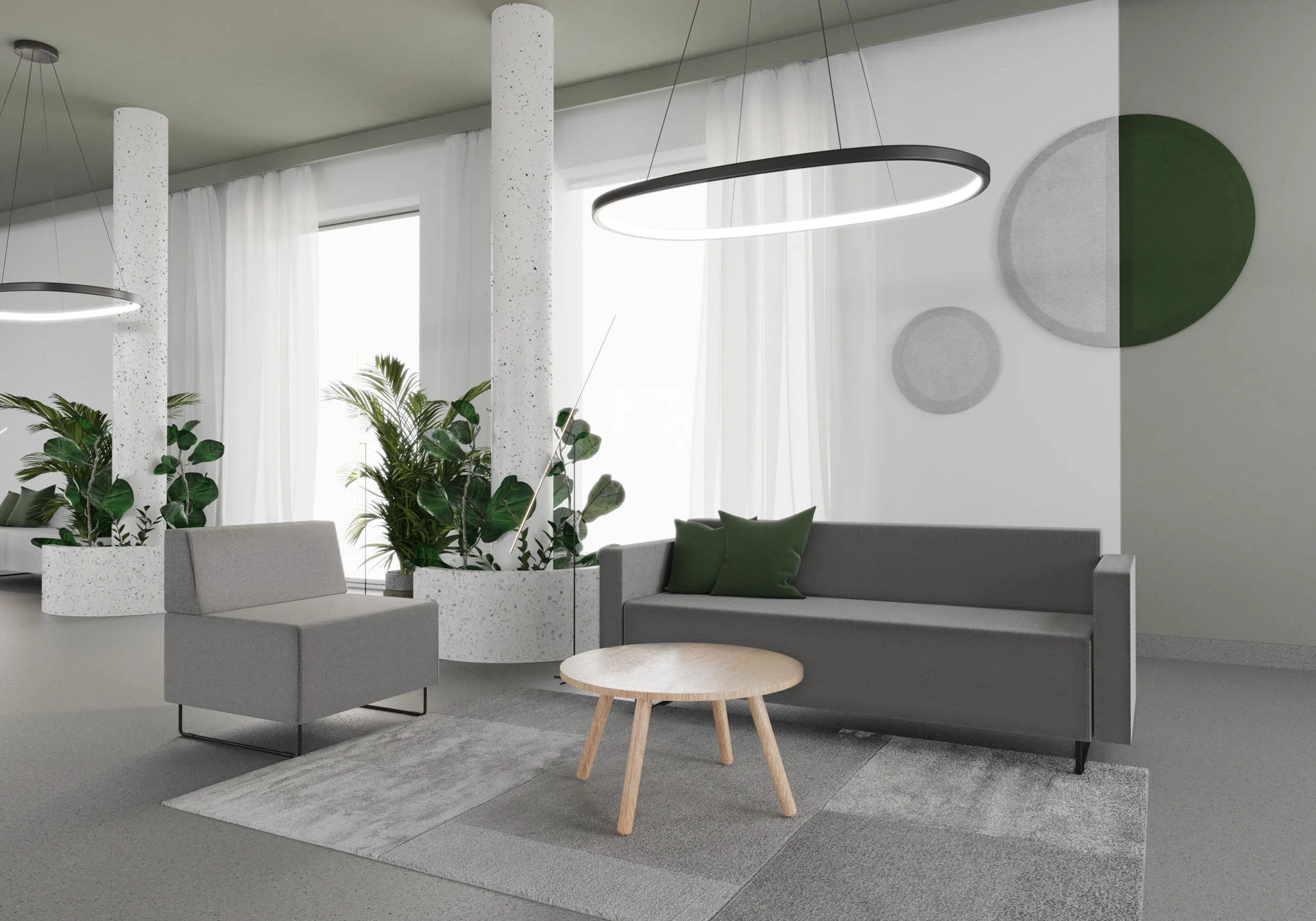 Ścianki akustyczne pokryte zostały specjalną włókniną dźwiękochłonną, aby poprawić komfort rozmów w biurze i zmniejszyć panujący w nim hałas.
