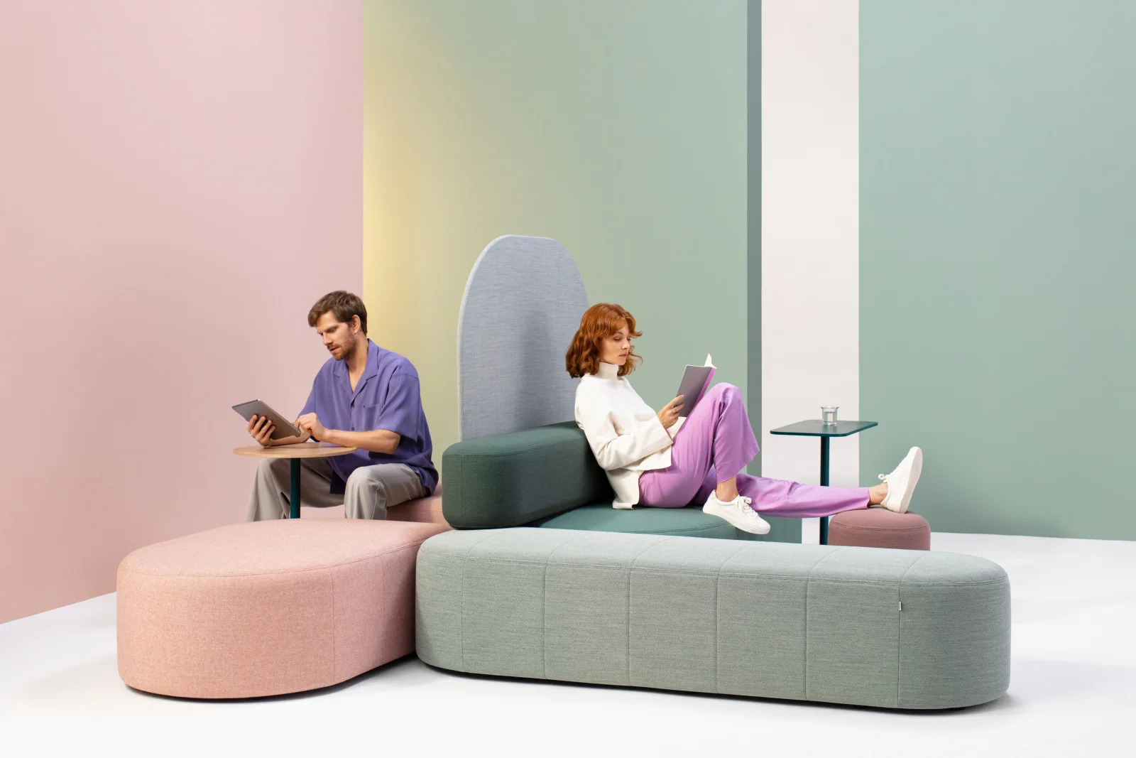 Kolekcja Revo obejmuje sofy z oparciami i bez, ścianki i pufy o miękkich, organicznych kształtach. Ta prosta tożsamość estetyczna została zainspirowana koncepcją „kwadratury koła”, tworząc łagodny geometryczny alfabet, który nie tylko wyróżnia kolekcję, ale także umożliwia łączenie elementów na wiele sposobów.