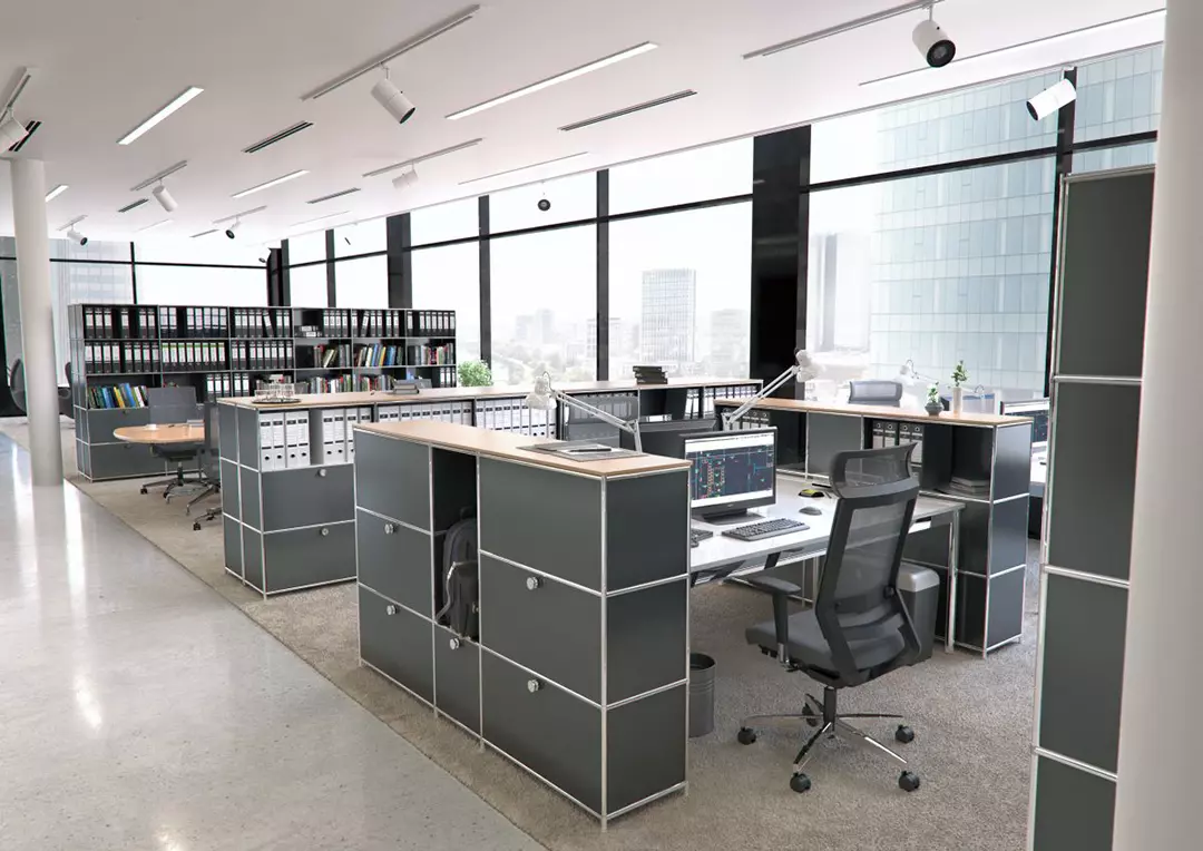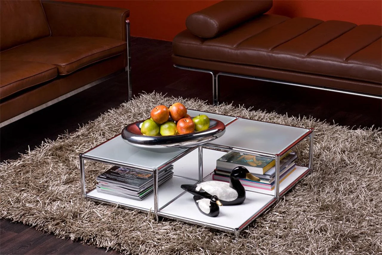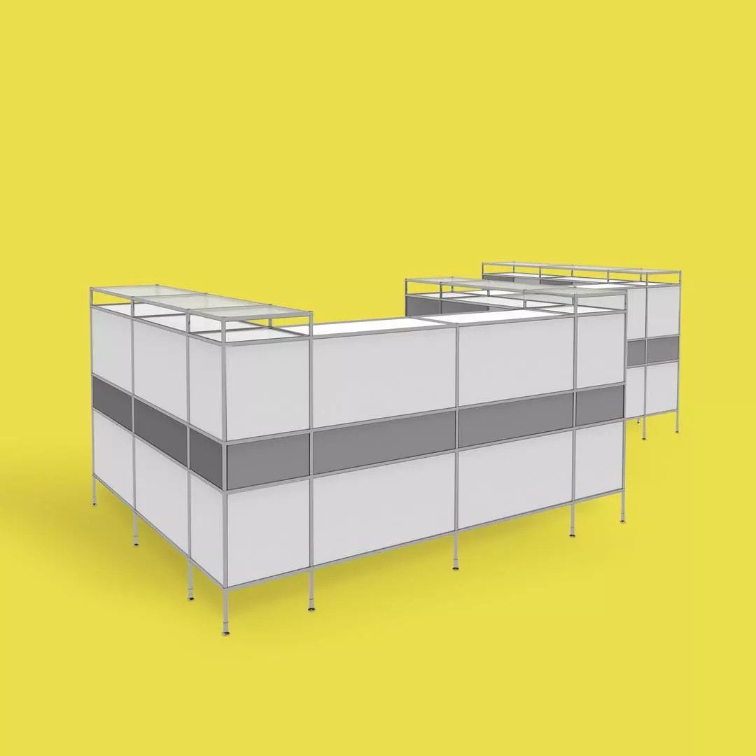 Podstawowa zasada Systemu4: rury stalowe są połączone z konstrukcją nośną za pomocą opatentowanych węzłów łączących. Stalowe tabliczki są bezpiecznie przymocowane wewnątrz, tworząc pojedyncze elementy mebli, które można złożyć i ponownie przekształcić w coś innego przy użyciu standardowych narzędzi. Możliwości dla biur, nieruchomości i domu są nieograniczone.