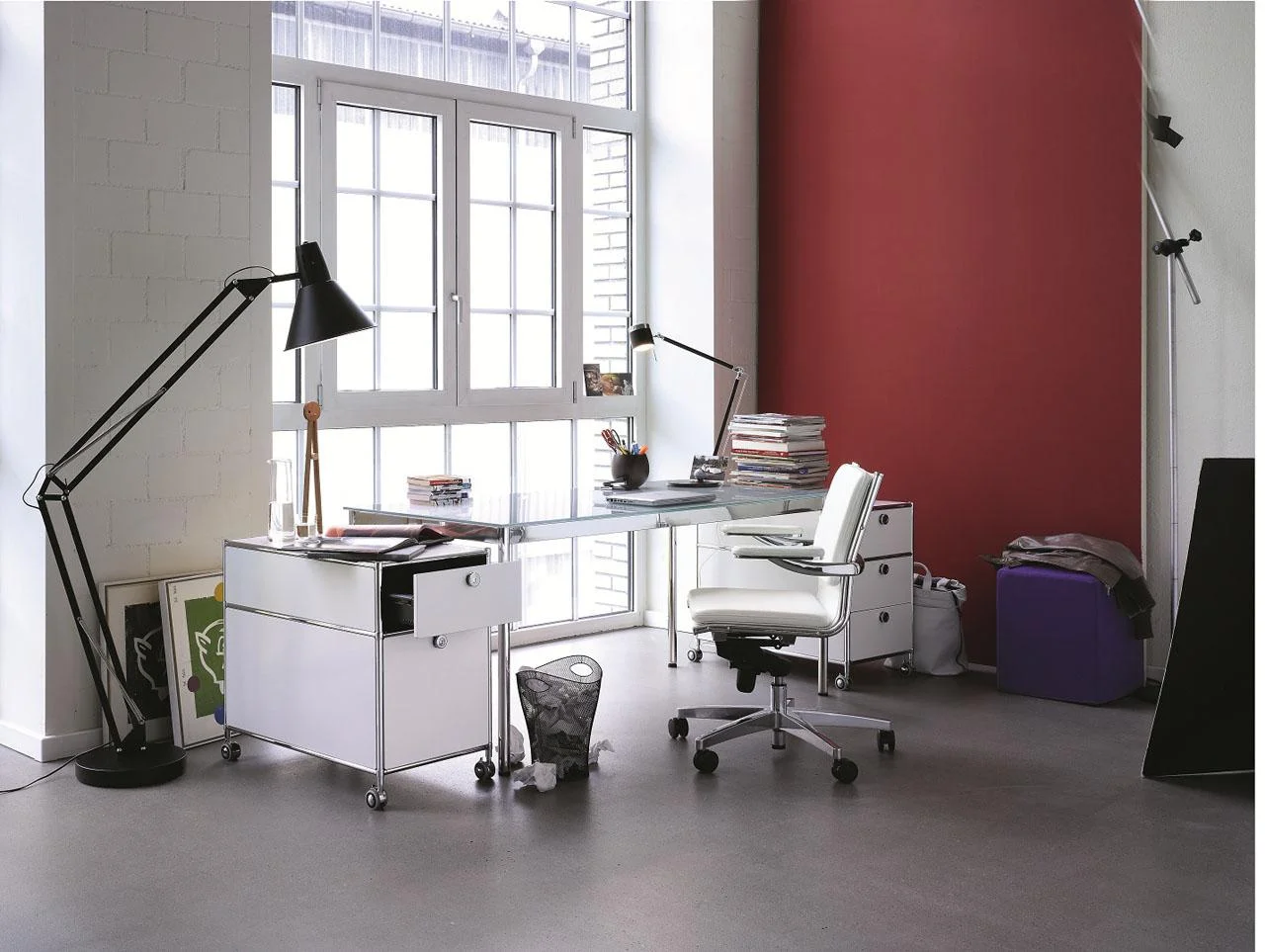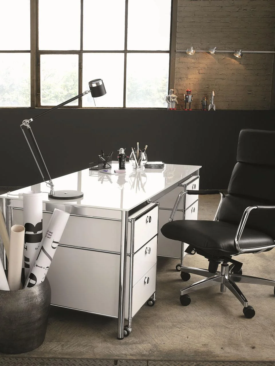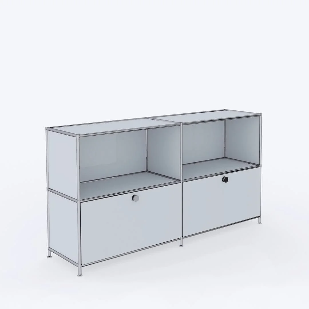 Podstawowa zasada Systemu4: rury stalowe są połączone z konstrukcją nośną za pomocą opatentowanych węzłów łączących. Stalowe tabliczki są bezpiecznie przymocowane wewnątrz, tworząc pojedyncze elementy mebli, które można złożyć i ponownie przekształcić w coś innego przy użyciu standardowych narzędzi. Możliwości dla biur, nieruchomości i domu są nieograniczone.