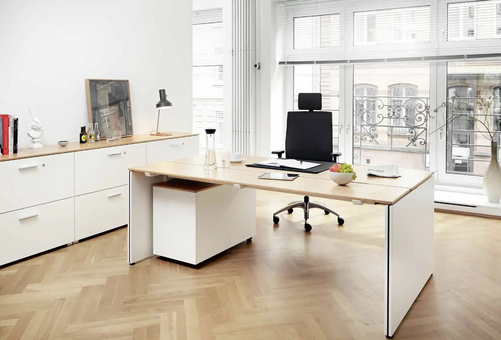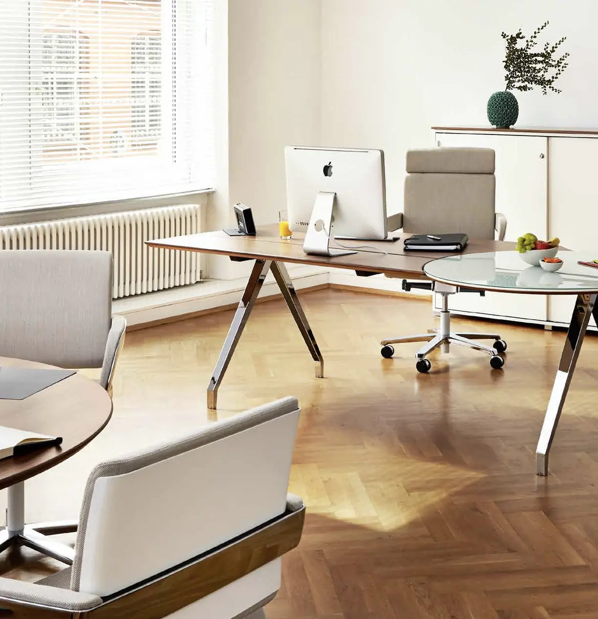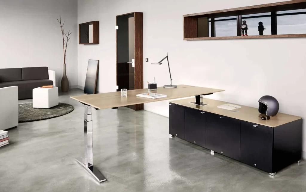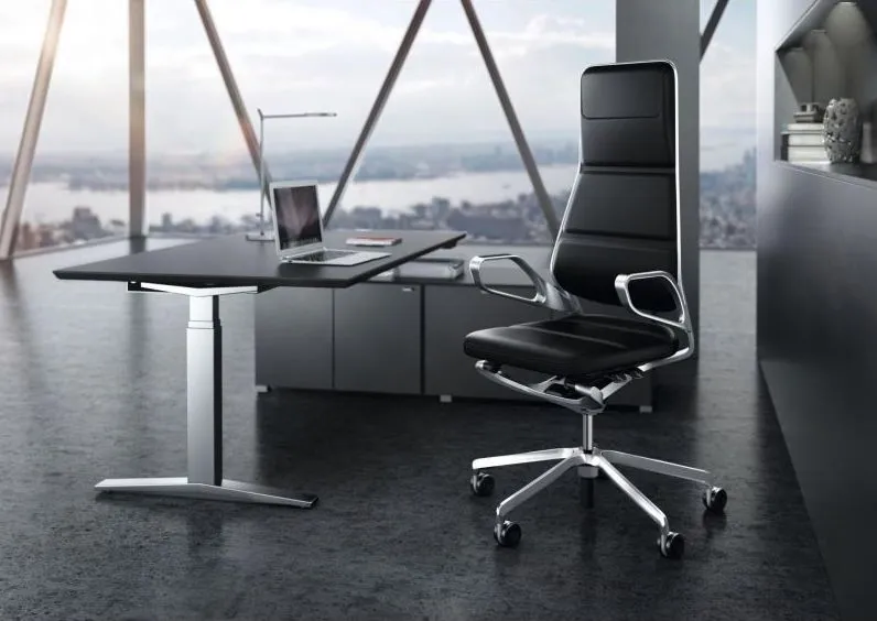 Table.Management to system dla dynamicznej pracy dzięki elektrycznej zmianie wysokości. Zestaw składający się z biurka, kontenera i szafki managerskiej jest jednocześnie elegancki i praktyczny.